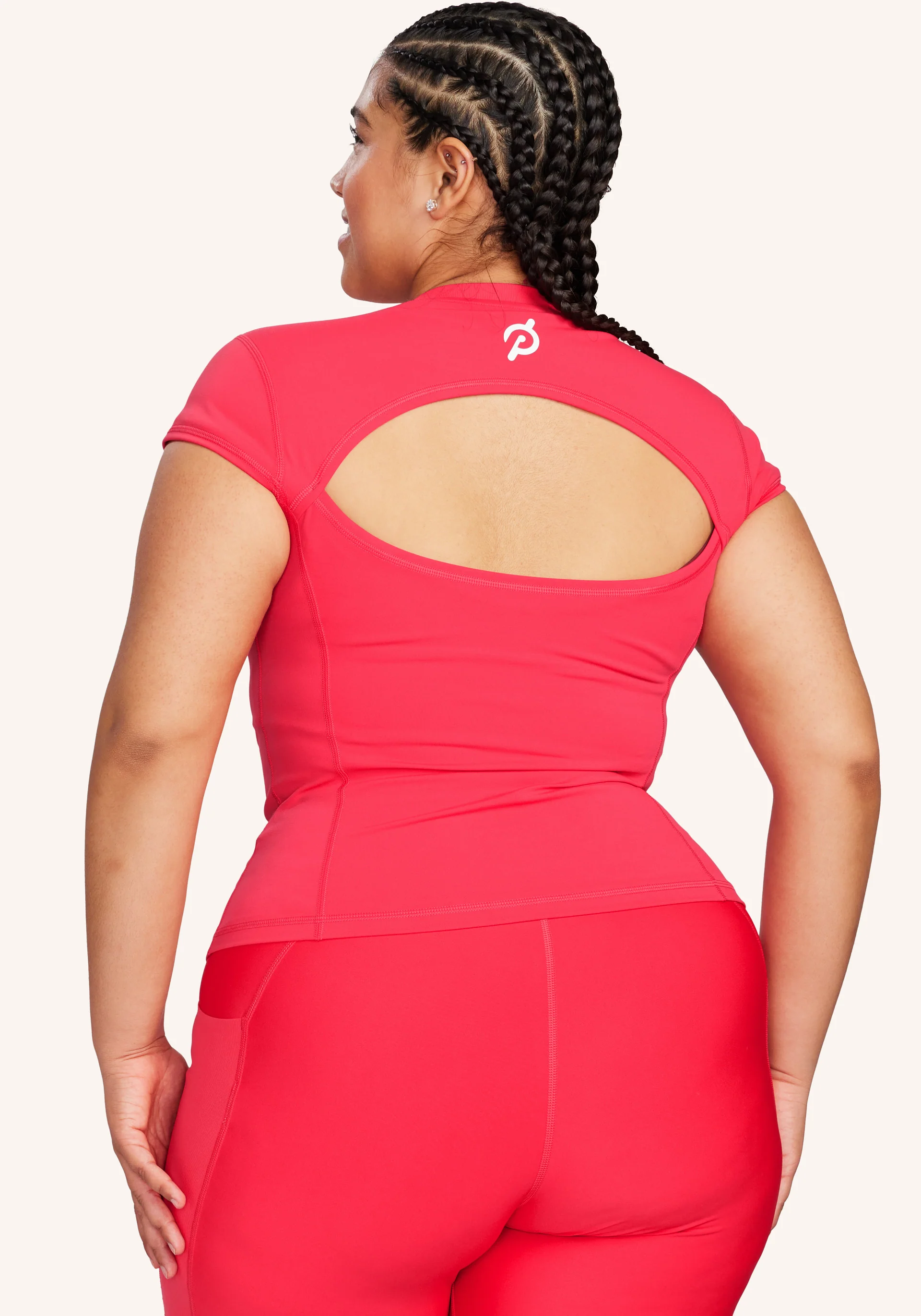 - Crewneck cap sleeve tee with princess seams and keyhole cutout at back