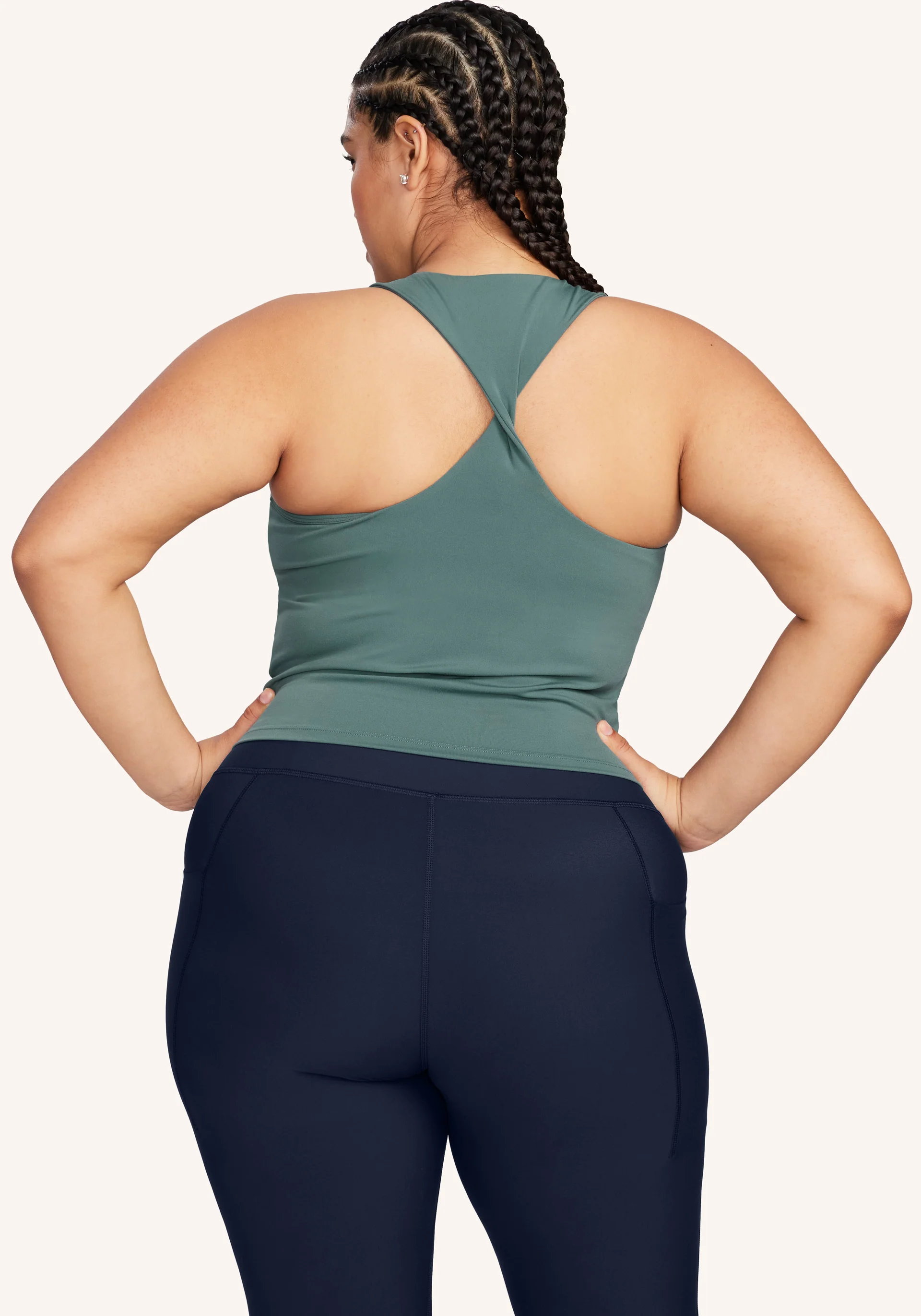 - Scoop neck crop tank with built in shelf bra and twist back detail