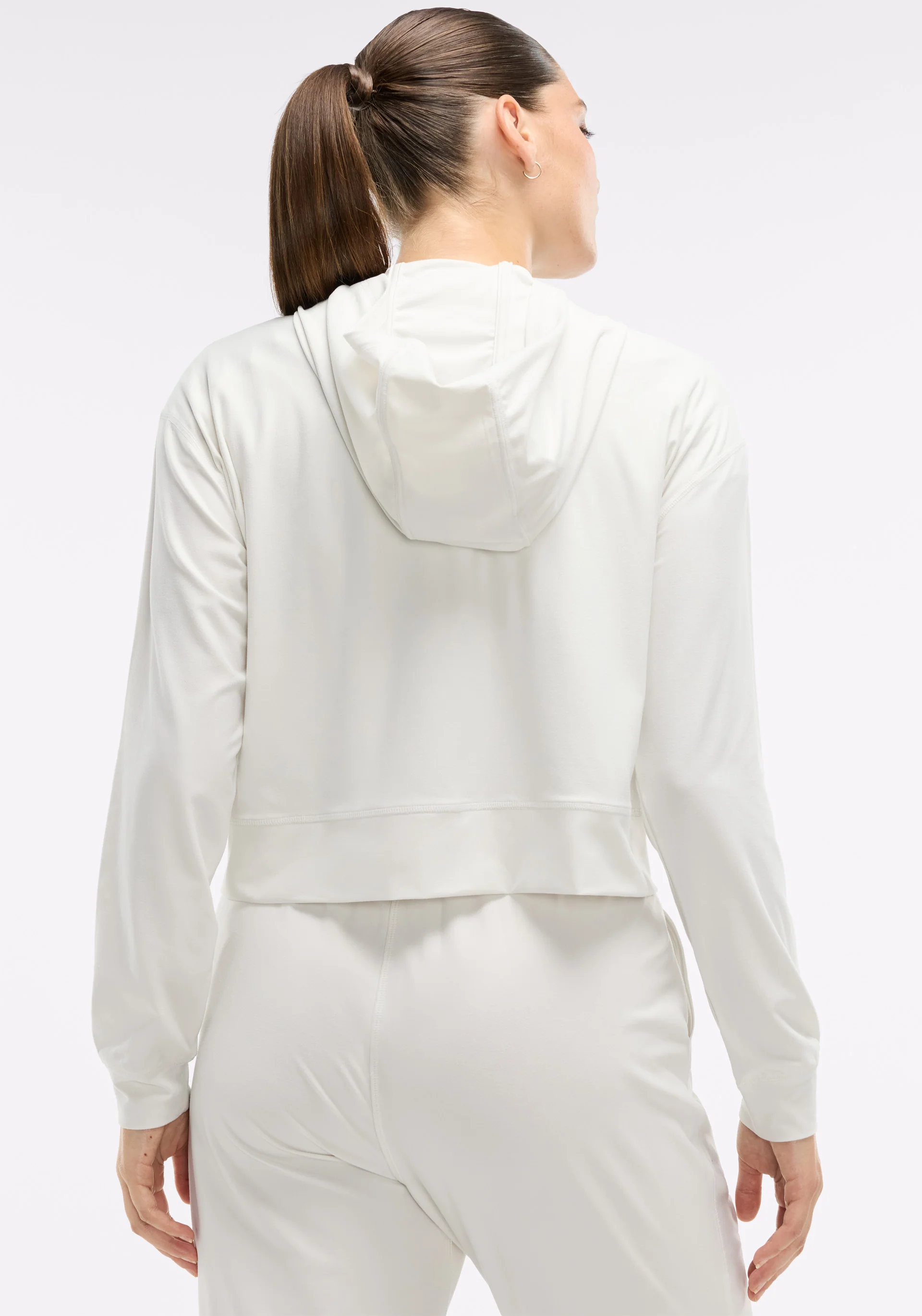 Full zip, boxy sweatshirt with meet and greet length, side pockets, and self fabric cuffs and bottom hem