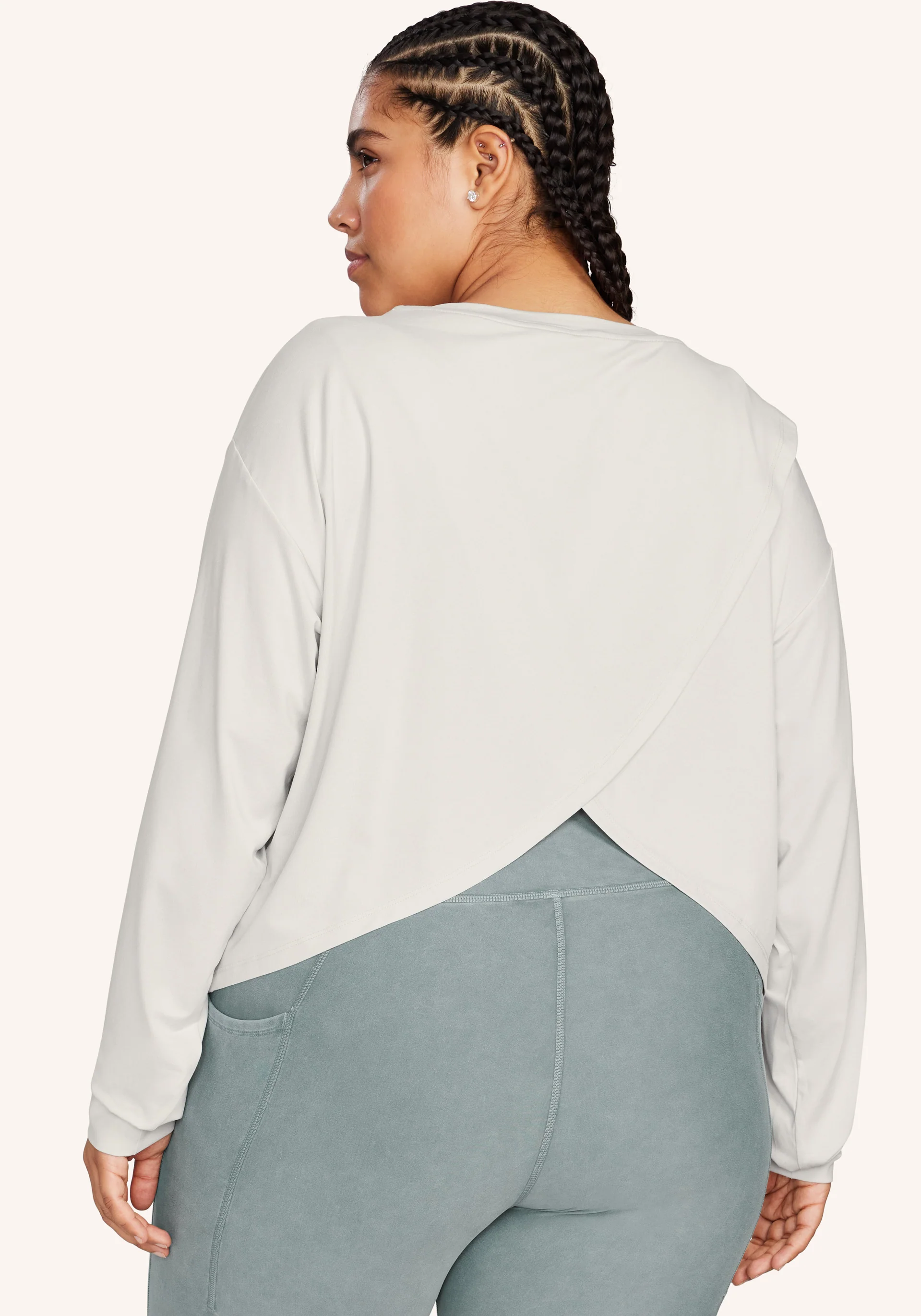 - Crewneck, drop shoulder long sleeve with tulip surplice back detailing