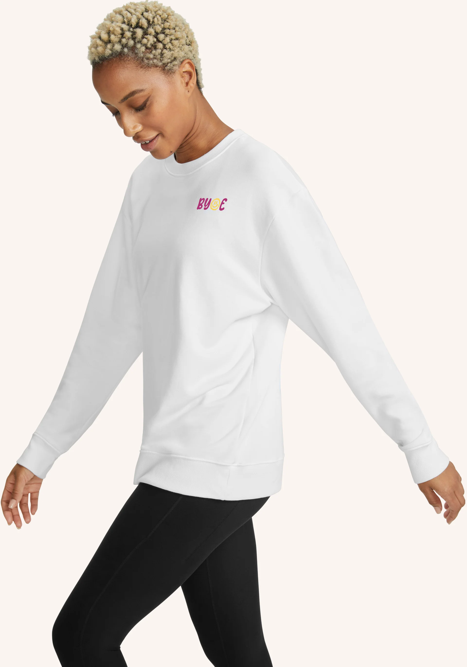 - Gender neutral, crewneck sweatshirt with a drop shoulder and rib detail at sleeve cuffs and bottom band